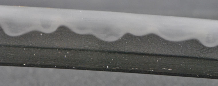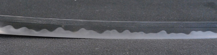 The forging is a prominent Itame mixed with Mokume-Hada giving off an impression of moistness of sparkling Nie and thick lines of Chikei forming the beautiful Konuka-Hada pattern in the Ji. conspicously unique to the workmanship of Tadakuni.