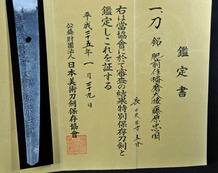 In support of this sword, there is a Sayagaki (attestation) by Dr. Kanzan Sato, amost distinquished sword scholar written on the Shirasaya attesting to its' authenticity, along with this is a document from the sword museum in Tokyo known to sword students as the NBTHK in the form of a certificate of Tokubetsu Hozon quality (especially precious)