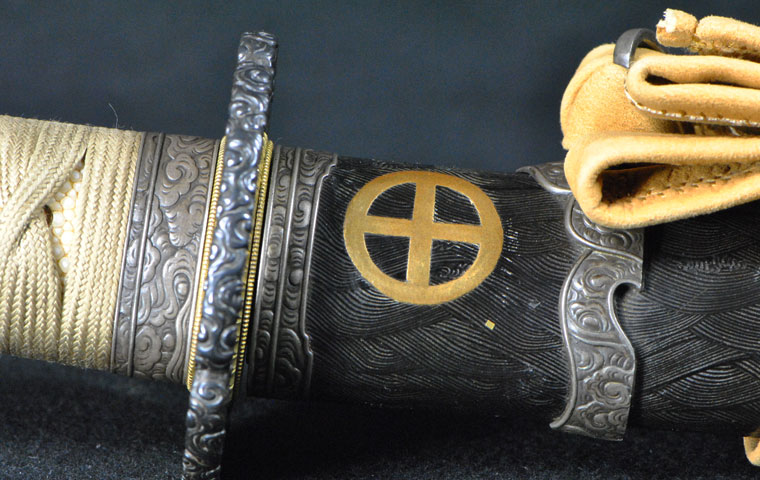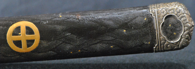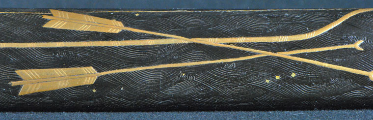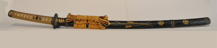 The Koshirae matches the sword in blackish purple wavy lines in its full length with good painted bow and arrow on its side and the gold painted family crest of the Nabeshima clan.