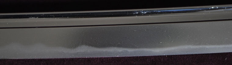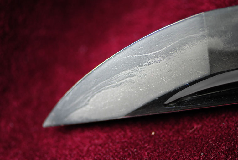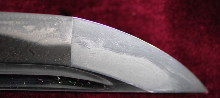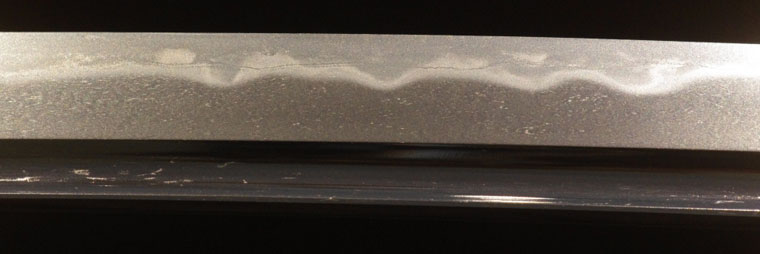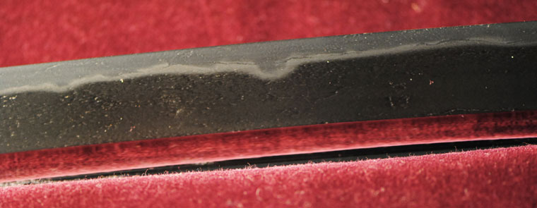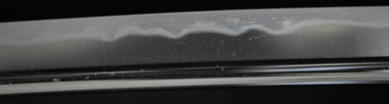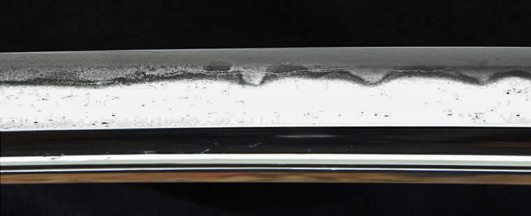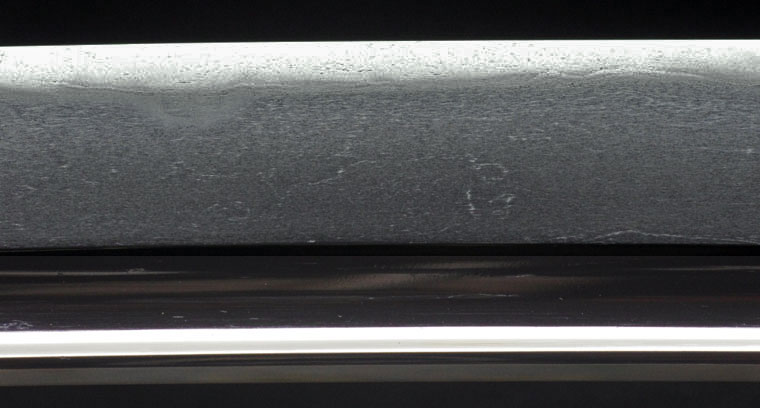 This particular sword is rather wide and thick with deep Sori, O-kissaki and Bo-Hi on both sides. The splendid Itame is well grained with ample Ji-Nie attached forming fine Chikei throughout. The Hamon is a Nie Deki on a basic Notare, with Gunome Ko-Gunome, Gunome Midare and some Togare with Sunagashi, short lines of Kinsuji along with some very long lines of Kinsuji. The Ji-Tetseu has Niku and it's delicate beauty will entertain the astute student for many fascinating moments. The sword comes with NBTHK Tokebetsu Hozon papers but I do believe this Shizu blade is a Juyo candidate and I highly recommend it to you.